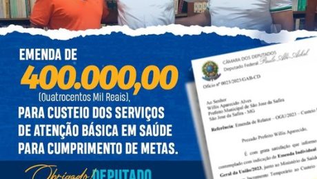 Mais recursos para a saúde da nossa cidade. A Prefeitura de São José da Safira recebeu recursos de R$ 400 mil para o custeio dos serviços de Atenção Básica em Saúde. O aporte é uma conquista do Município com o apoio do deputado Paulo Abi-Ackel.
