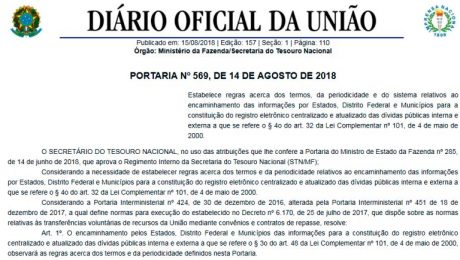 As dívidas públicas, interna e externa, referidas na portaria, para a constituição do registro eletrônico centralizado e atualizado são aquelas regidas pelo inciso quarto do artigo 32 da Lei Complementar 101/2000, que trata da autorização específica do Senado Federal, quando se tratar de operação de crédito externo. Já a legislação estabelece normas de finanças públicas voltadas para a responsabilidade na gestão fiscal. A Confederação Nacional de Municípios (CNM) esclarece que não haverá necessidade de obter outro sistema informatizado ou contratar pessoal para a operação por se tratar de preenchimento exclusivamente declaratório no site do Sadipem.